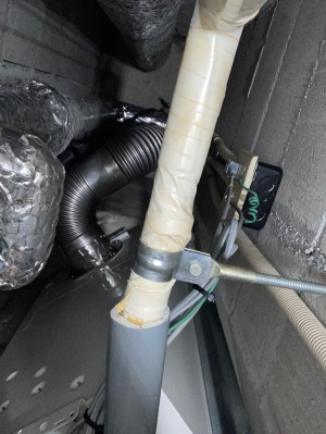 電気メーターは中部電力さんに一時外してもらいます。それ以外は当社で取り外して給湯器の裏側に体が入れるようにスペースを空けます。今回は給湯器裏が狭く、ここまで空けてもギリギリの作業でした。