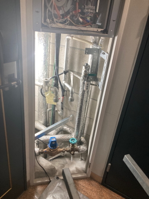 PS後方給排気タイプの給湯器が設置されているマンションでは給排気筒用の点検口がついていないケースが多くあります。PS設置後方給排気タイプの取り替えでは排気筒の取り外し、取り付けが一番の難関です。