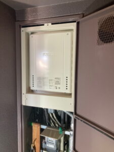 千種区でPS(パイプシャフト)扉内設置後方給排気延長タイプの給湯器の取替工事をさせていただきました。給湯器の後方に給排気筒が接続されている給湯器です。